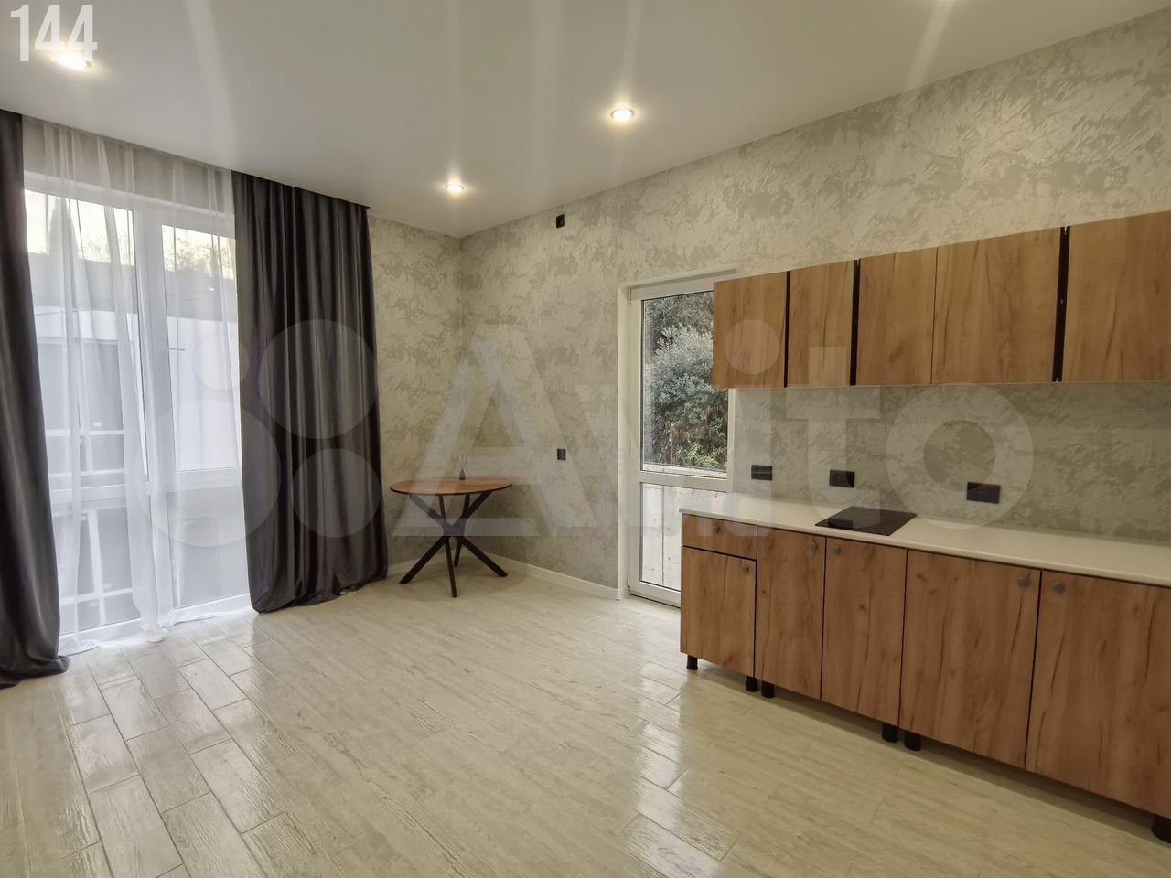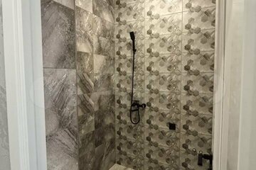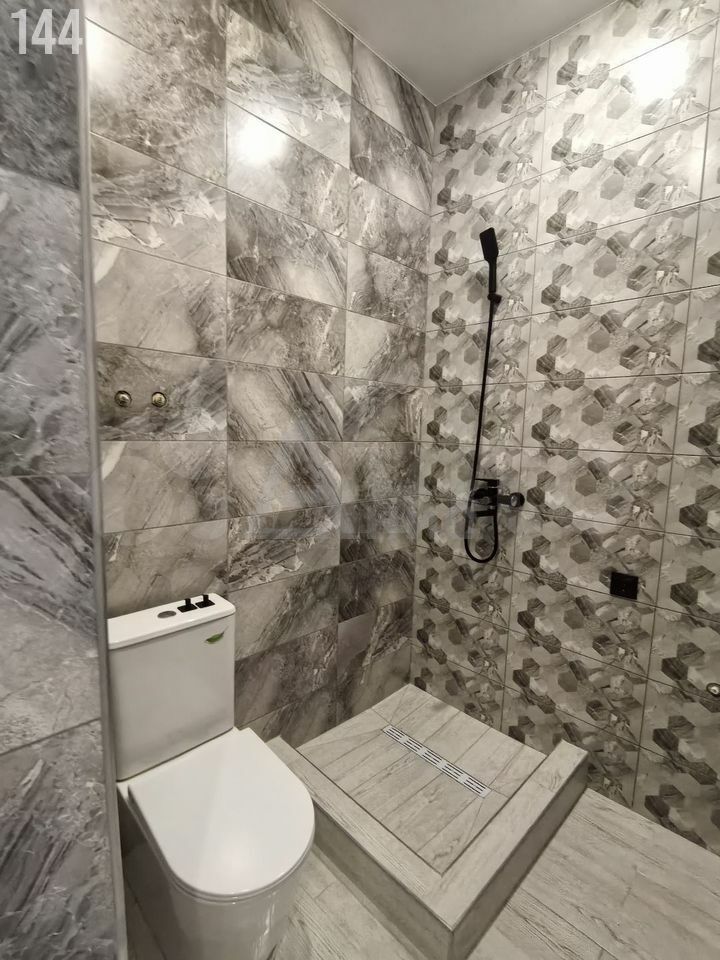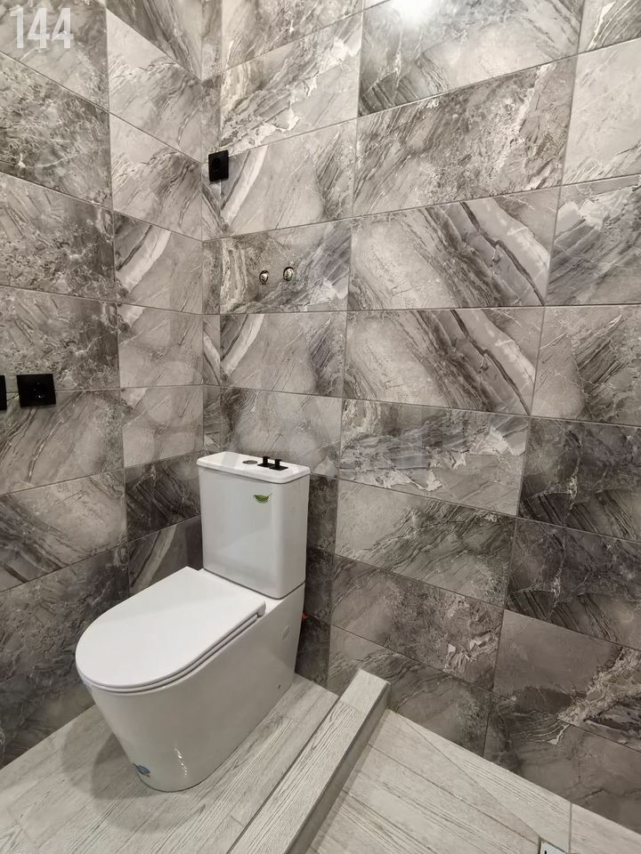 - Теплый, водяной пол, покрыт плиткой под ламинат. Натяжные потолки. Санузел плитка.